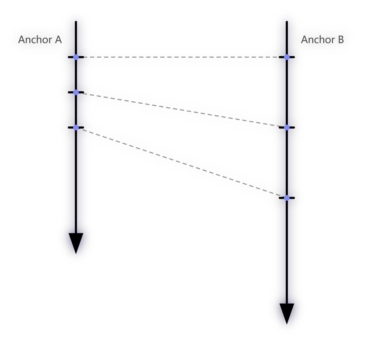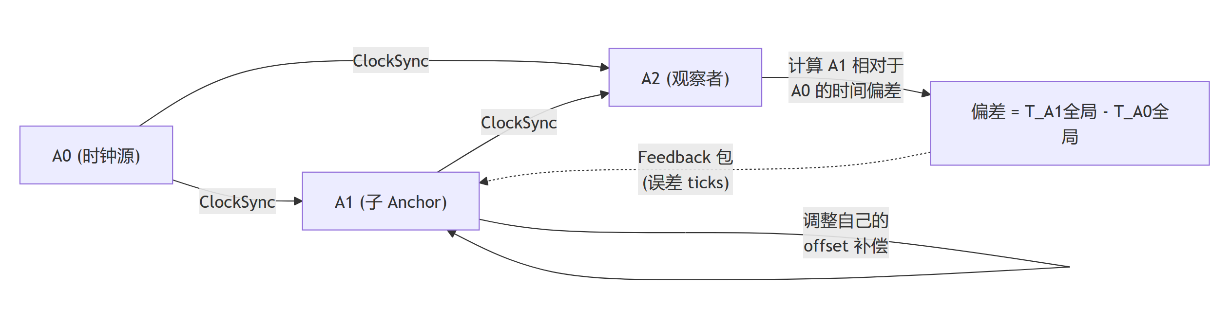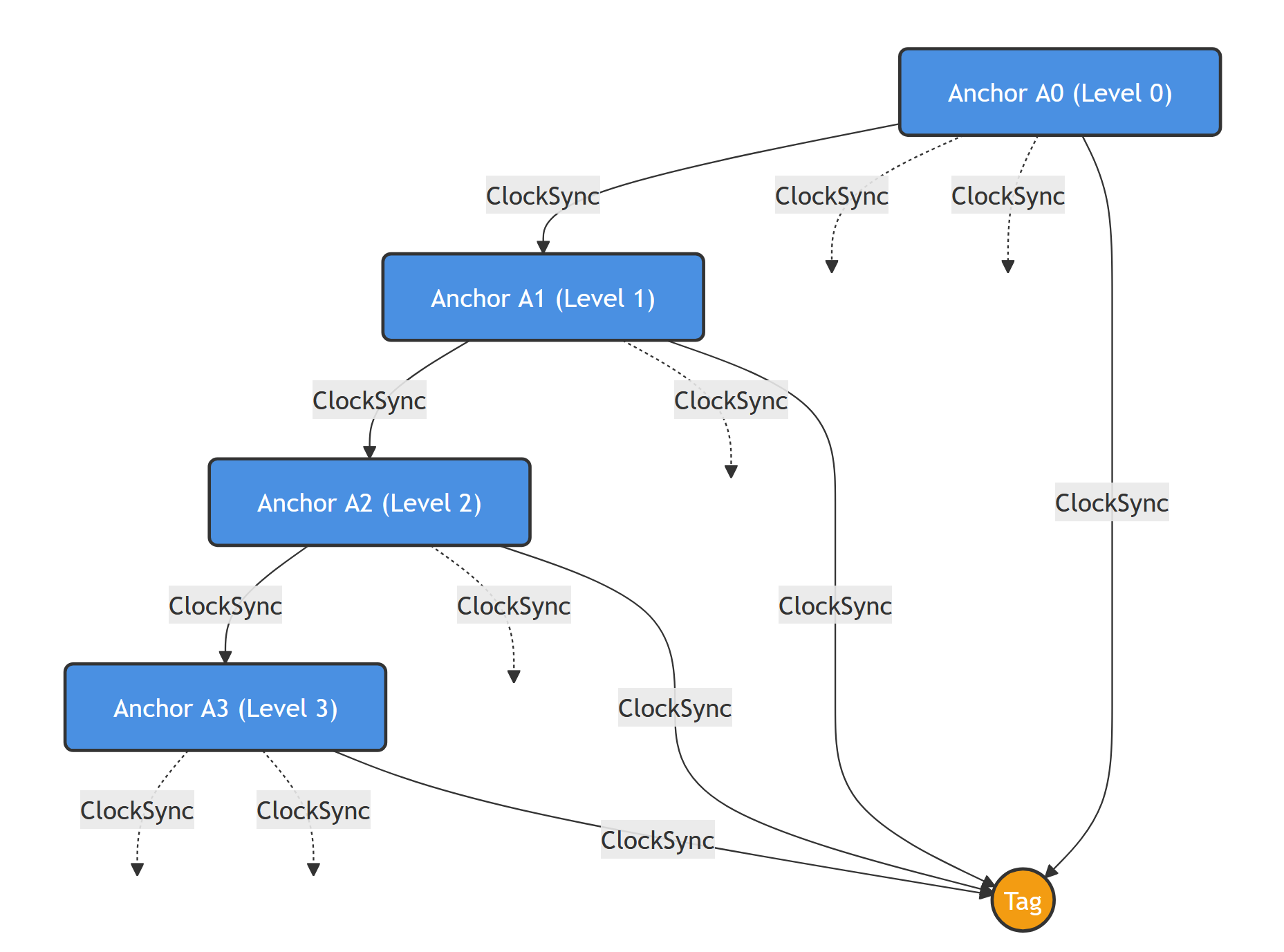通常,我们会指定一个 Anchor 作为时钟源(Root Clock Source),它定期发出时钟同步信号。其他 Anchor 接收时钟源的同步信号,并在内部维持一个与时钟源一致的"全局时间"。这个过程我们称之为时钟同步(Clock Synchronization)。