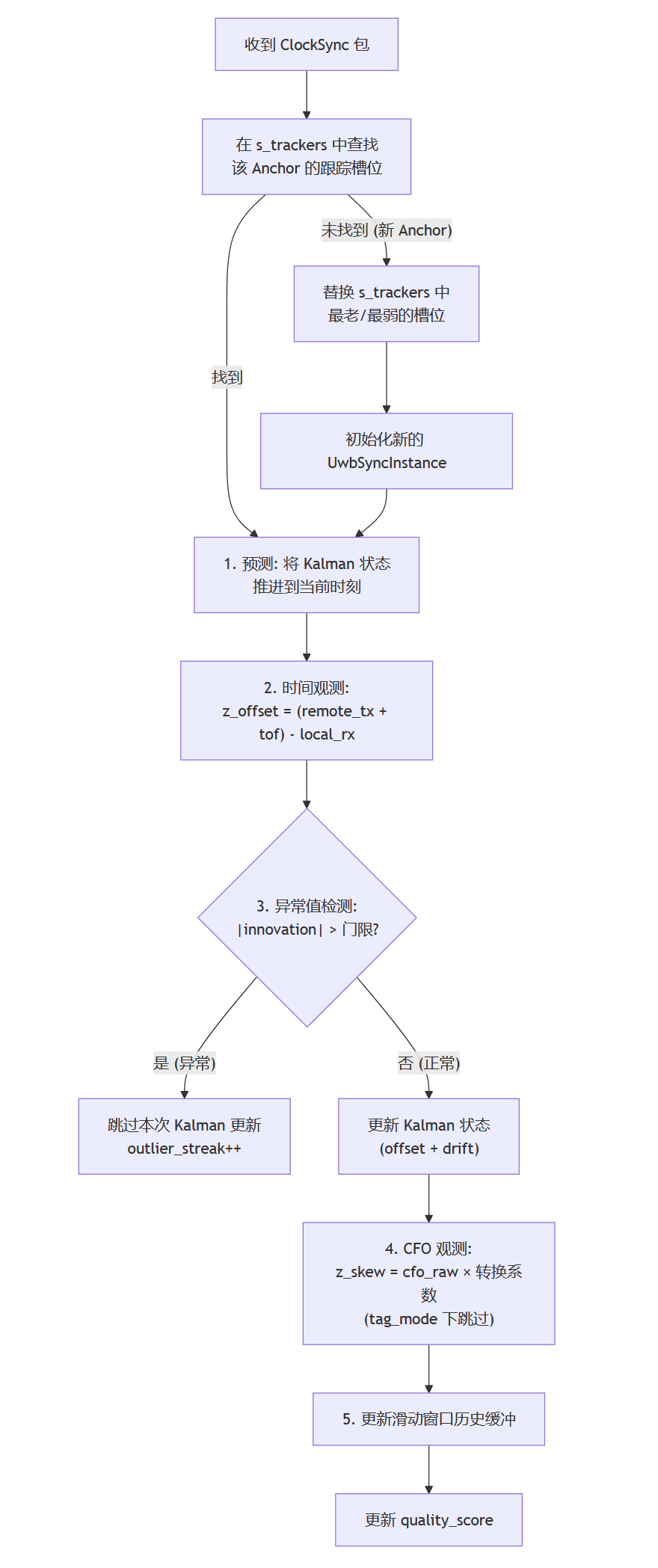 为了解决这个问题,Tag 端需要对 Anchor 进行锁定操作。所谓"锁定",本质上是 Tag 与某个 Anchor 进行时钟同步,在 Tag 内部维持从该 Anchor 得到的"全局时间"。这样 Tag 就可以随时将自己的本地时间转换为该 Anchor 对应的"全局时间"。