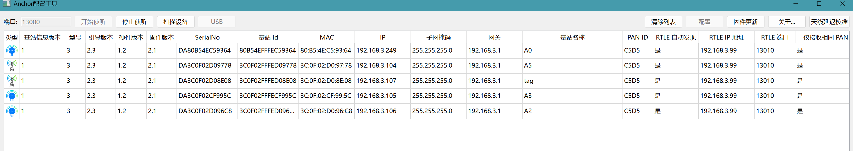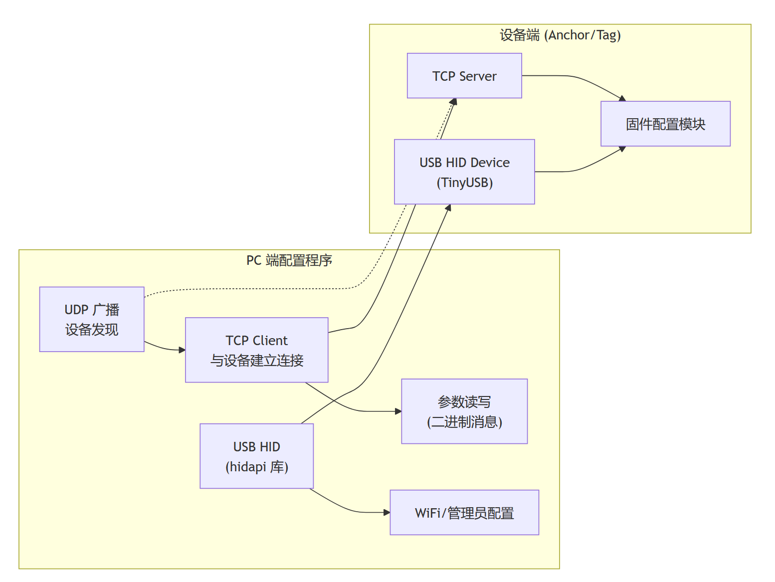- 设备发现:配置程序启动后通过 UDP 广播发送发现请求,局域网内的所有 Anchor/Tag 收到后回复自己的 IP 地址和基本信息。