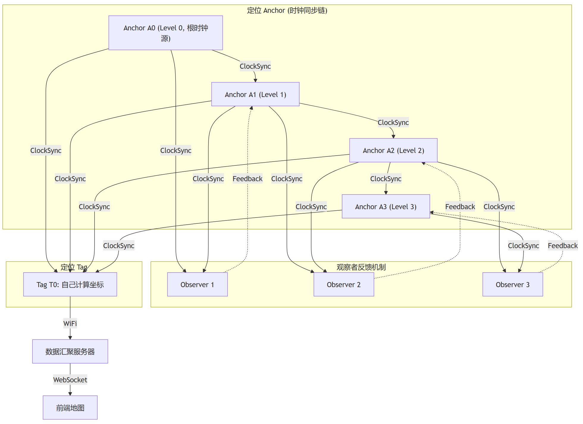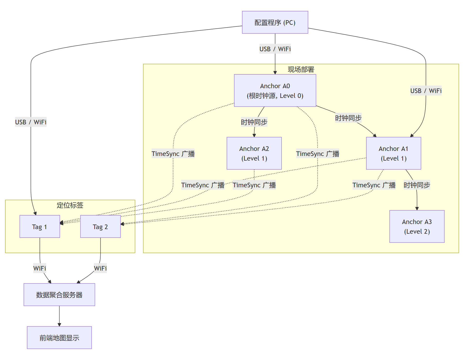 - 事先在现场部署一些定位 Anchor 硬件,这些 Anchor 之间保持时钟同步,并通过 WiFi 接入局域网