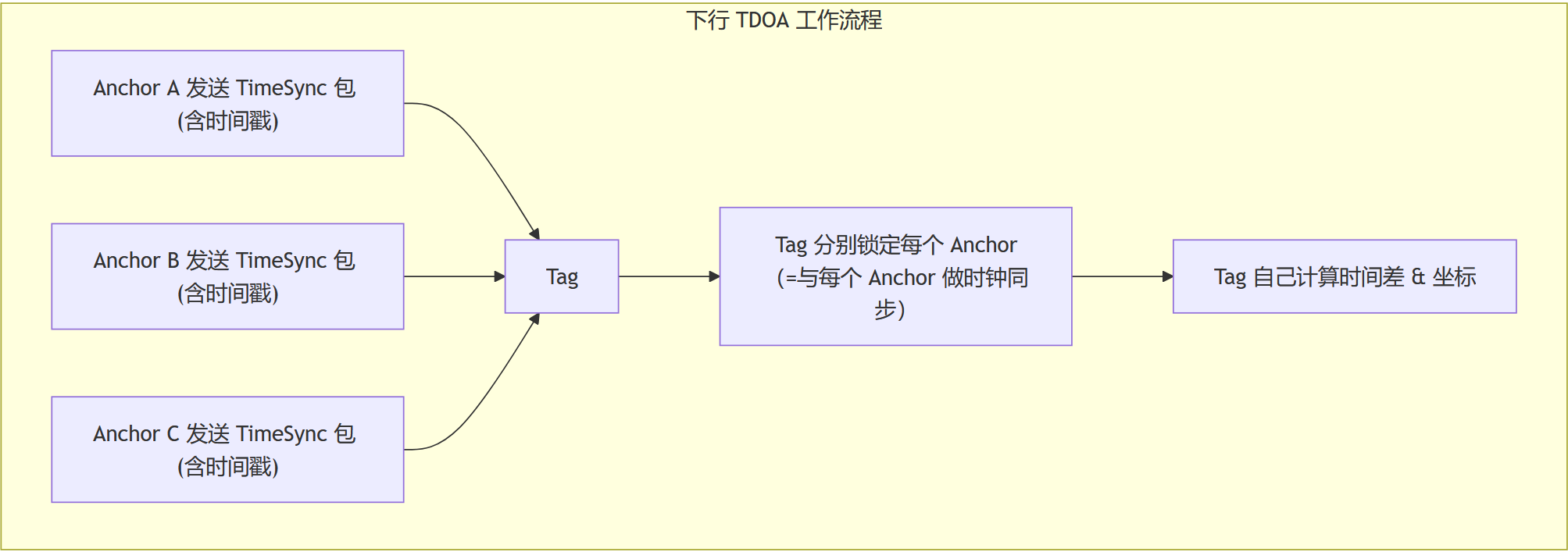原因在于:通常 Tag 的接收机只有 1 个通道,同一时刻只能接收一个信号。各个 Anchor 是在不同的时刻发出的数据包,Tag 当然是在不同的时刻收到。因为发送时间不同,所以不能直接用 Tag 收到数据包的本地时间戳相减来得到时间差(距离差)。