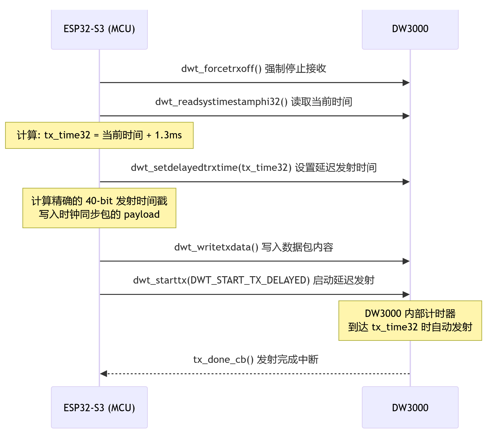 DW3000 芯片在接收数据包时,其内部的载波恢复环路会估算出载波频率偏移(CFO)。这个值反映了发送端和接收端晶振频率之间的差异。CFO 本身就是一种"频率差"的物理测量,它可以作为辅助信息来判断时钟漂移率(drift/skew),也可以帮助识别异常的接收事件。后续章节在讨论高级时钟同步时会用到这个值。