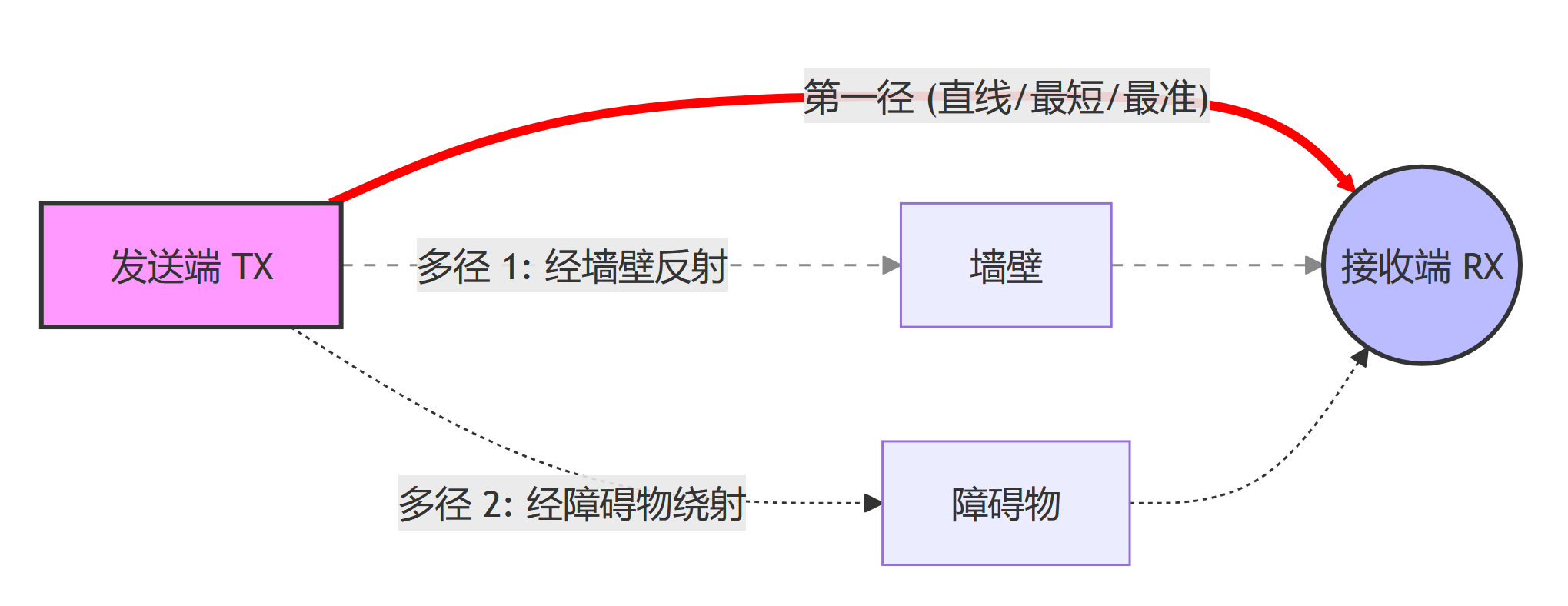 - 红色直线:从发送端到接收端的第一径(First Path),路径最短,时间最准。