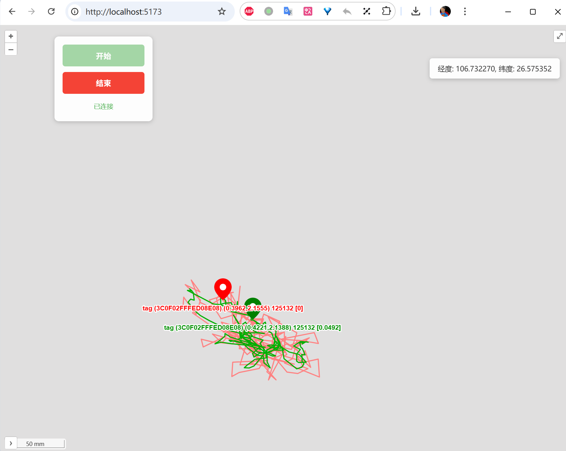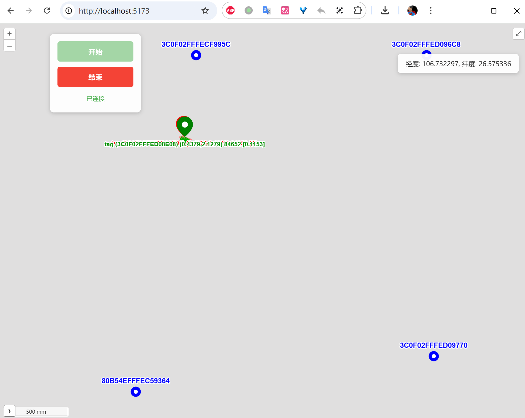 地图前端在浏览器中加载后,会与消息汇聚程序建立 WebSocket 连接,实时接收来自汇聚程序的消息(主要是 Tag 坐标和 Anchor 坐标),把 Anchor 和 Tag 的位置实时显示在地图上。