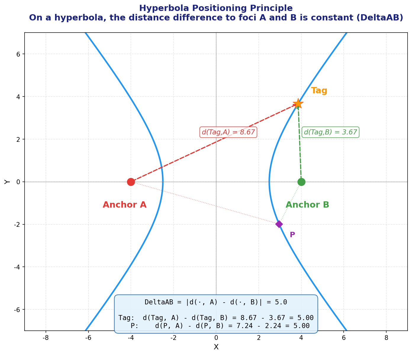 从数学的角度来看,假设 Tag 到 A/B 间的距离差是 ΔdABΔdAB。如果以 A/B 分别作为两个焦点,我们可以在空间中画出一条双曲线(或三维中的双曲面),这条双曲线上的任意一个点到 A/B 间的距离差都恰好等于 ΔdABΔdAB。双曲线上的任意一个点都有可能是 Tag 的位置。