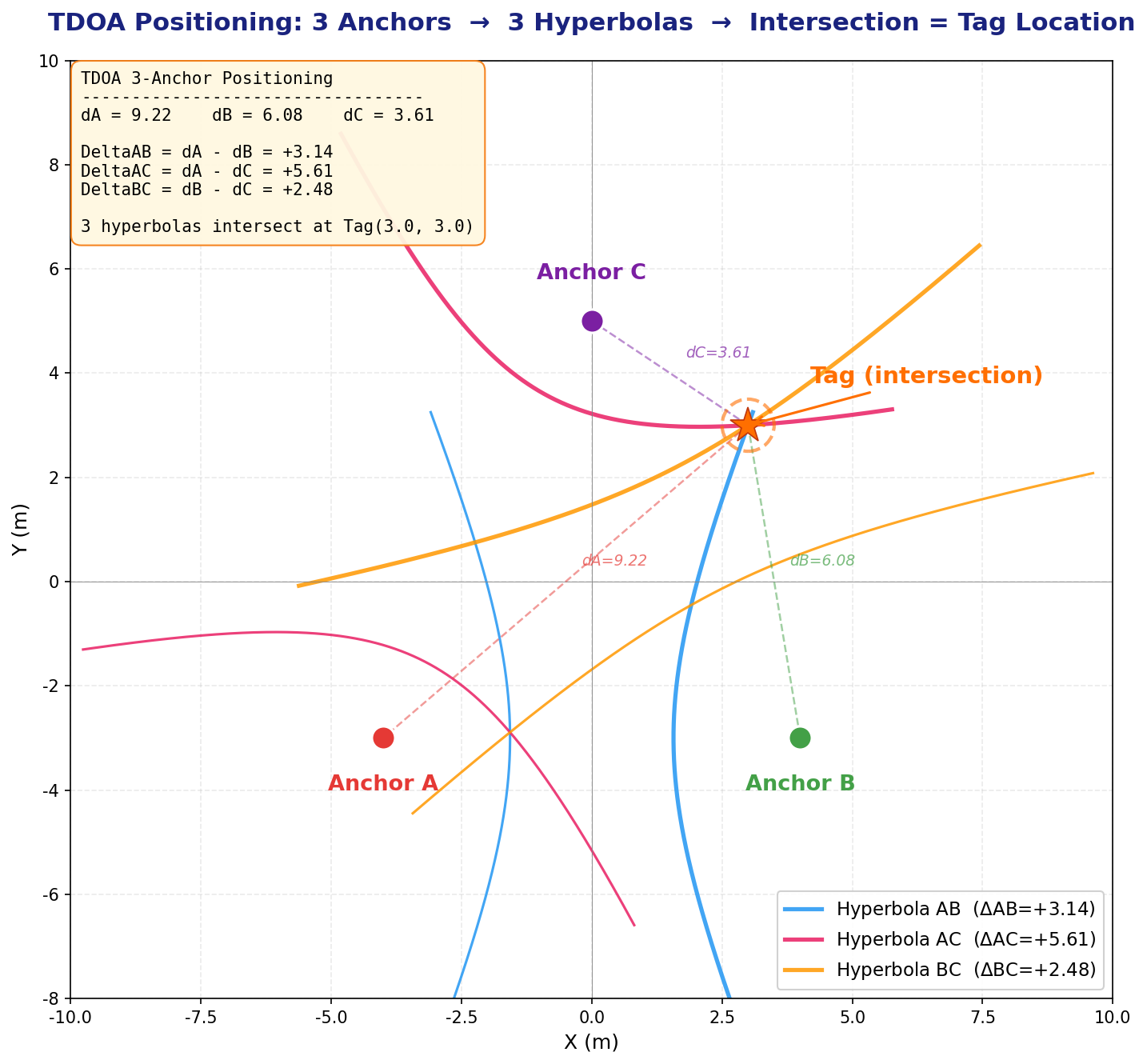 如果还有一个 Anchor C,那么我们可以得到 Tag 到这三个 Anchor 两两之间的时间差 ΔdABΔdAB / ΔdACΔdAC / ΔdBCΔdBC,从而画出 3 条双曲线,这 3 条双曲线的交点就是 Tag 的坐标。