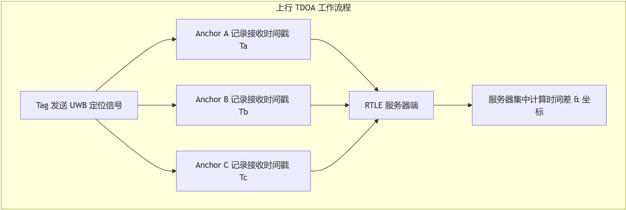 我们知道,上行 TDOA 由 Tag 发送定位信号,各个 Anchor 接收。我们只需要把各个 Anchor 接收信号的全局时间戳相减,就得到了时间差。